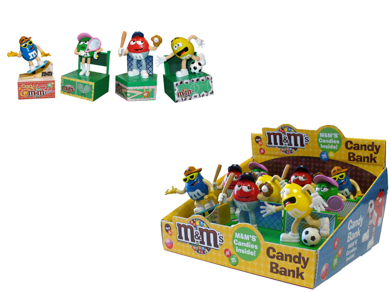 Item 10474- Your favorite M&M characters playing their favorite sports on these fun coin banks! Comes with a mini pack of M&M's inside. Packed (6) 12 count displays per case.