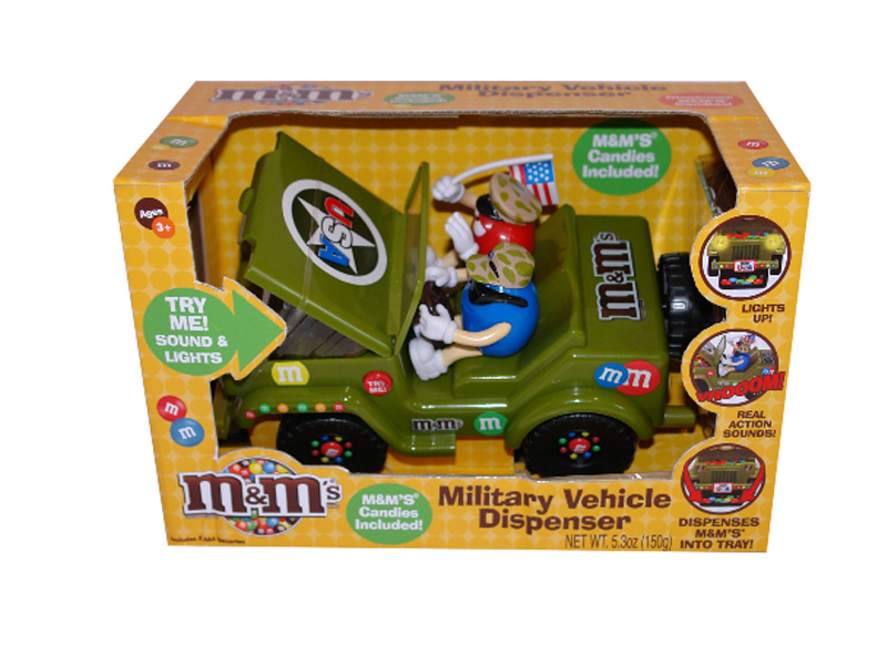 Item 31372: The perfect Christmas gift for that military loved one! Red and Blue M&M characters show off their patriotic spirit driving this jeep dispenser. Pull Red's arm to dispense M&M's. Working lights and sound!! Includes M&M's! Packed 6 displays per case.