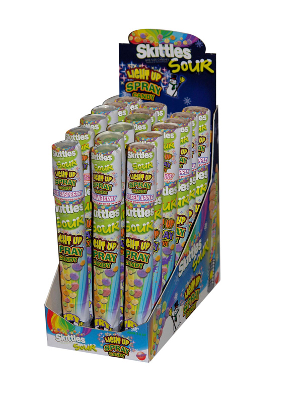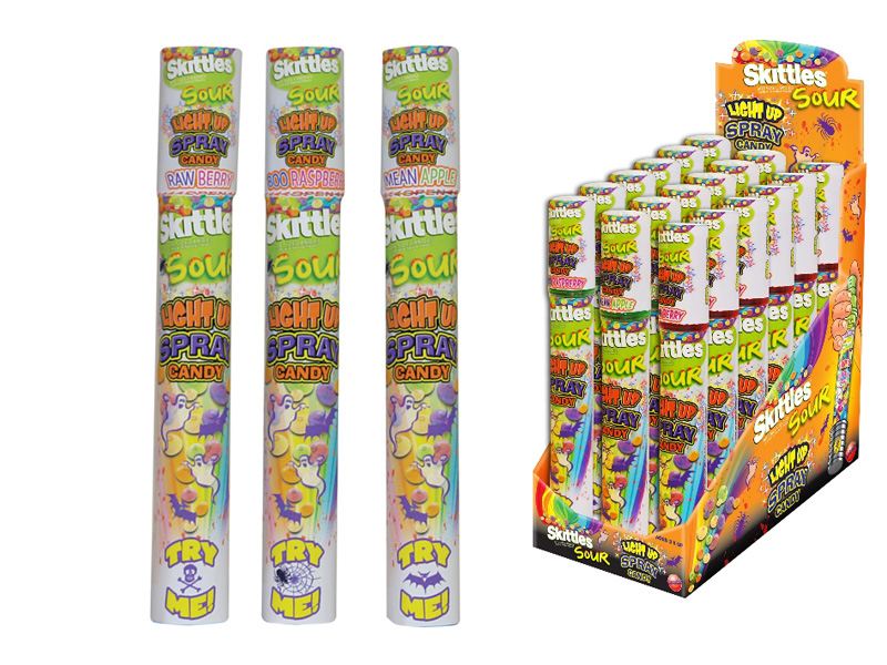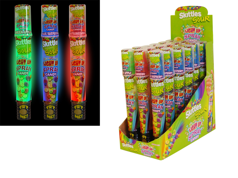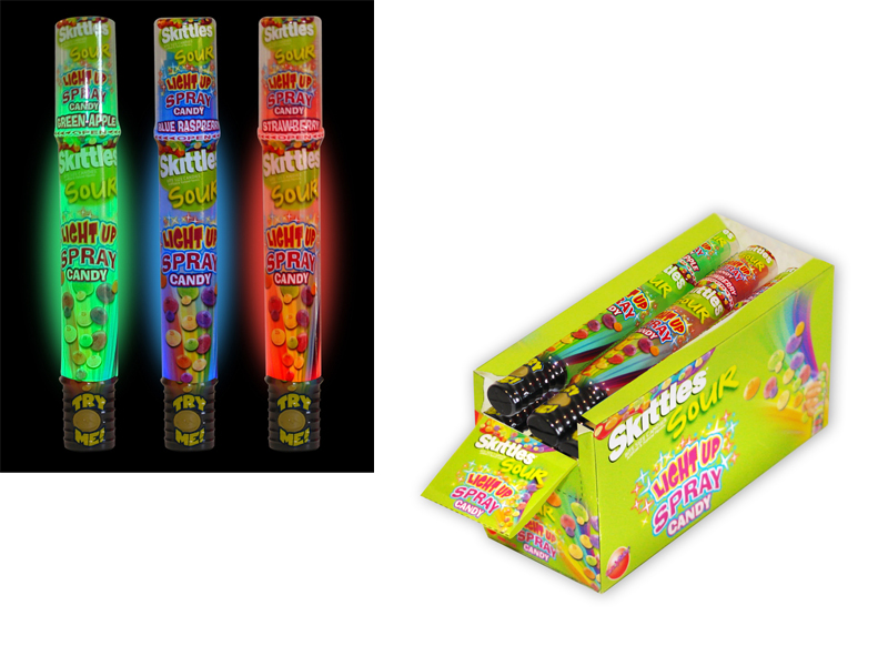 Item 8303: Taste the sour rainbow in this spray candy and light all in one! Press the button to light up your spray candy. Sour candy comes in 3 different color/flavor combinations- strawberry lights up red, green apple lights up green and blue raspberry lights up blue. This version of our Skittles Lite Up Spray is in a lay down display pack which allows the 'Try Me' feature to be more prominent. Packed (8) 12 count displays per case.