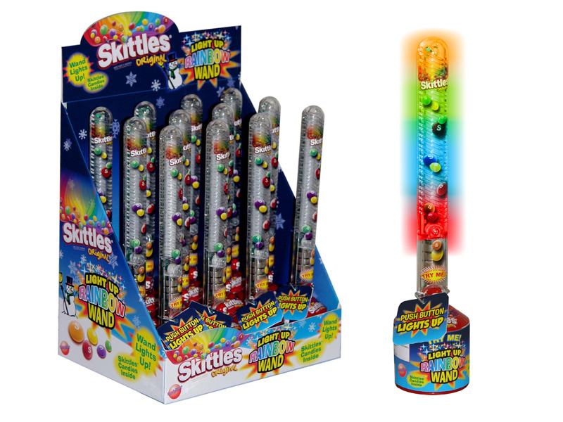 Item 19485- Taste the rainbow! This exciting new Skittles Rainbow Wand lights up in three different lighting patterns. Wave it though the air in the dark and it creates a rainbow. Auto shut off in 10 seconds. Great Try Me Feature. Be seen after dark with rainbow of colors. Base contains one bag of Skittles. Packed (6) 12 count displays per case.