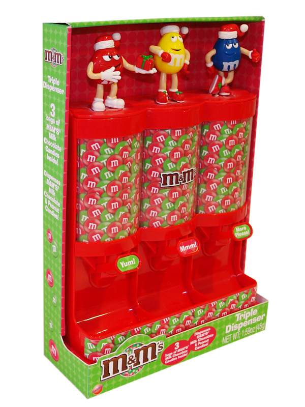 Item 52191: Triple the fun with this M&M Christmas Triple Dispenser! Includes 3 fun size bags of M&M's. Packed 12 dispensers per case.