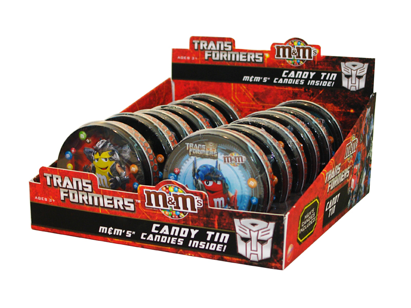 Item 8627: Your favorite M&M Red and Yellow characters as cool Transformers featured on these cool tins. 2 mini packs of M&M's inside. Packed (6) 12 count displays per case.