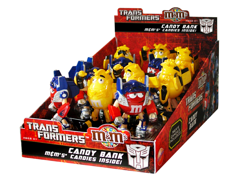 Item 8658: Your favorite M&M Red and Yellow characters as cool Transformers on these coin banks. Mini pack of M&M's inside. Packed (6) 12 count displays per case.