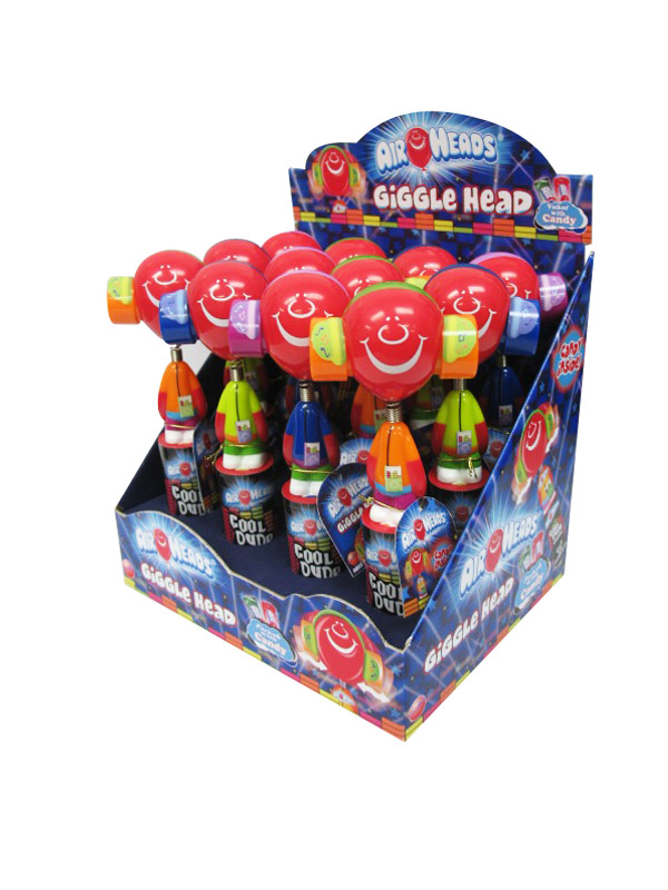 Item 19843- Shake it to the left, shake it to the right! These fun giggle heads giggle when you shake them! Comes with 2 bars of Airheads candy. Packed (6) 12 count displays per case.
