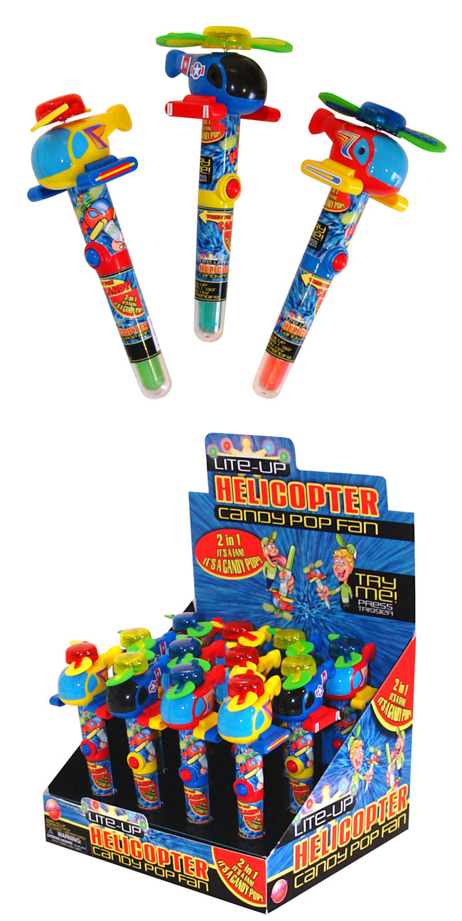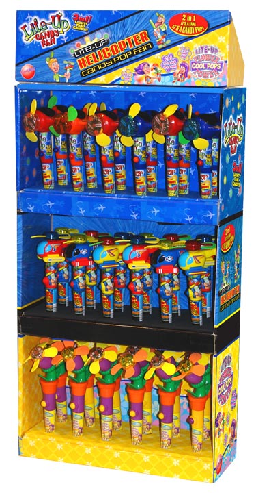 Item 2040: Lights change patterns as the powerful, child-safe fan spins. Lollipop in the handle. Packed (6) 12 count displays per case