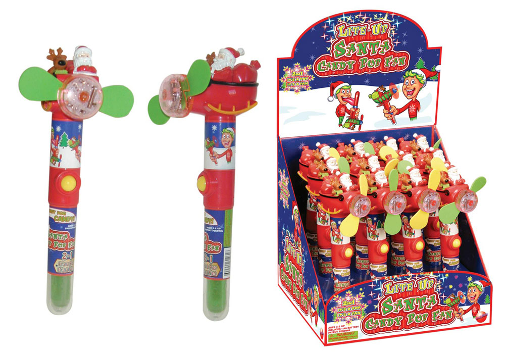 Item 2946: Santa lights his way as he delivers presents- with a powerful, child safe fan. A perfect stocking stuffer! Lollipop in the handle. Packed (6) 12 count displays per case.