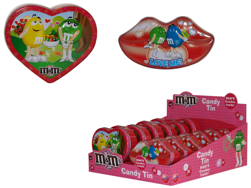 Item 52258: Hearts and kisses, that's what Valentines Day is all about! Give one of these tins to your sweetheart on that special day! Each tin comes with 1 fun size bag of M&M's. Packed (6) 12 count displays per case.