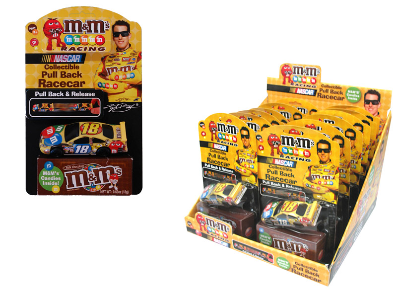 Item 18969- Pull it back, let it go and watch it race like the big cars!! This fun NASCAR racecar comes with a mini pack of M&M's. Packed (6) 12 count displays per case.