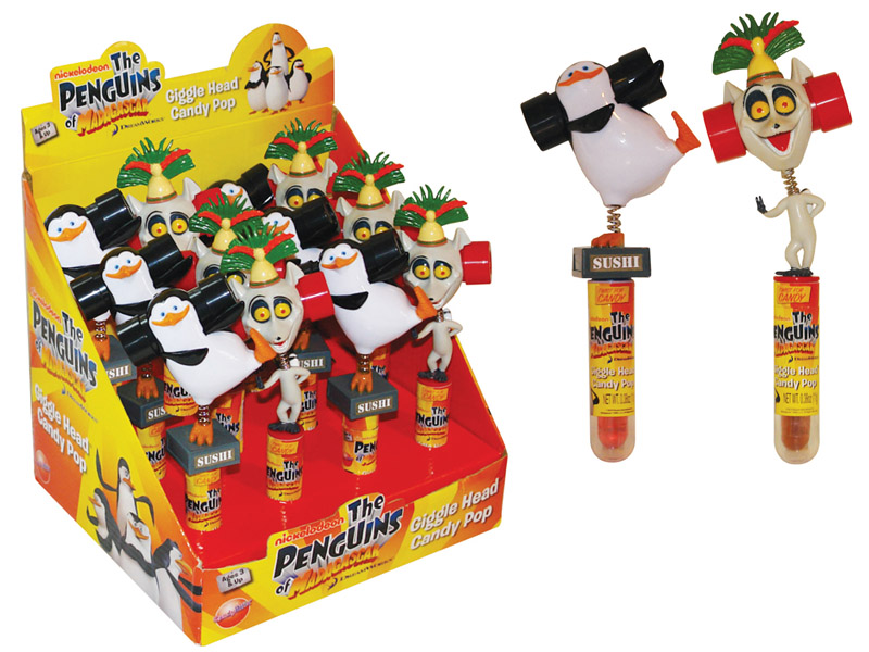 Item 10818: From the hot show on Nickelodeon come these fun giggle head pops featuring King Julien and the Penguins! Shake it to the left, shake it to the right and hear it giggle!!! Packed (6) 12 count displays per case.