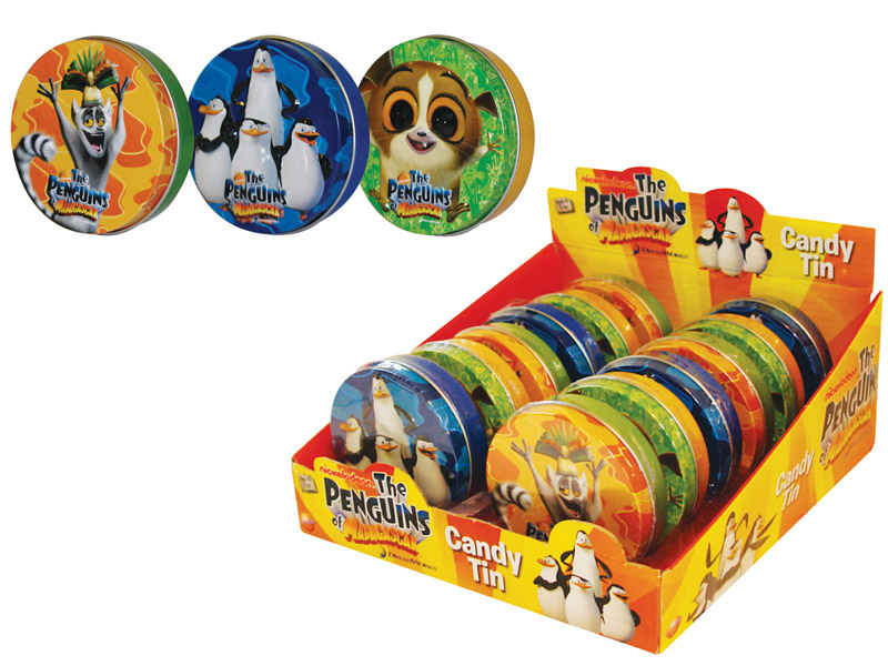 Item 10788: Your favorite penguins and King Julien from Penguins of Madagascar on these great tins! Each tin comes with microbites candy inside! Packed (6) 12 count displays per case.