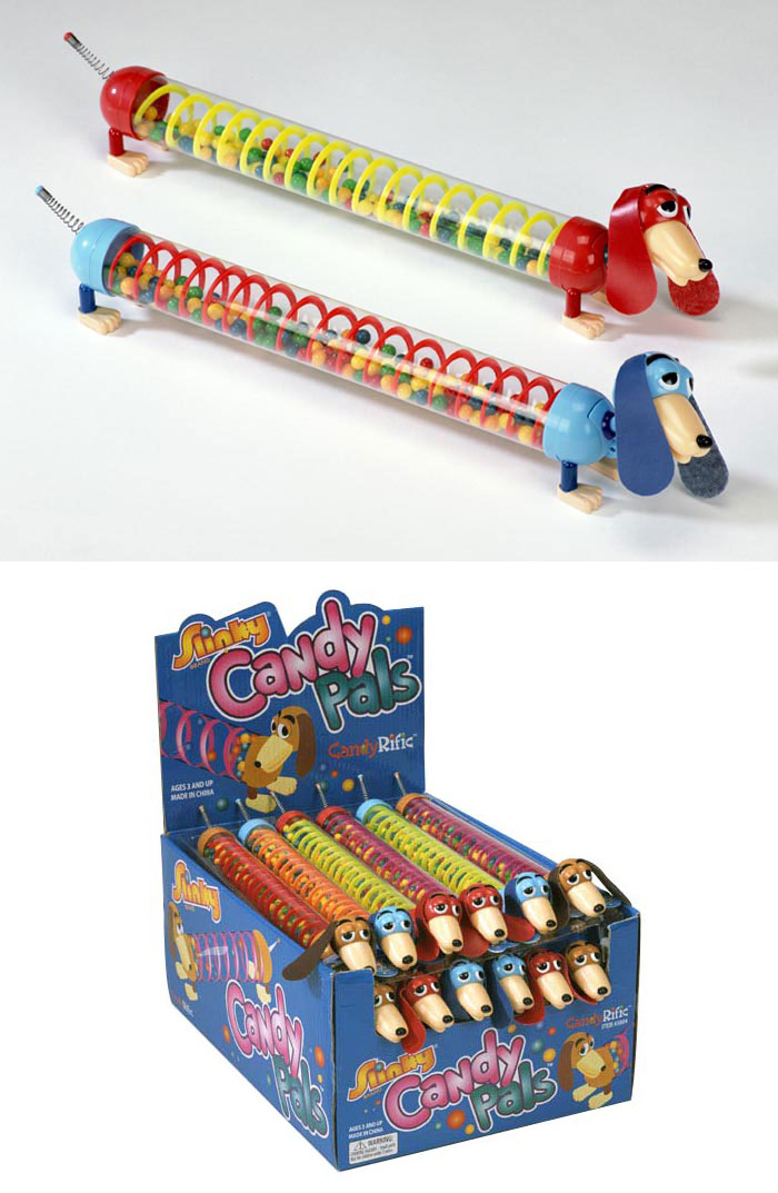 Item 5804: Dog pal with a Slinky for a body. Watch as the candy inside spins around the Slinky as you flip it over! Micro bites candy included. Packed (8) 12 count displays per case