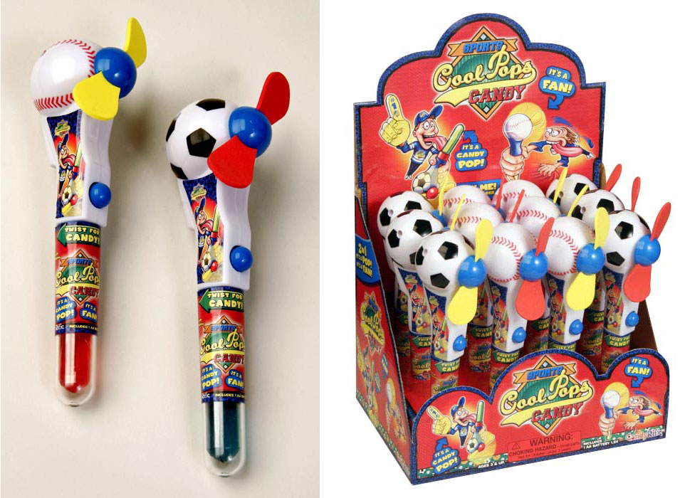 Item 1168: Soccer and Baseball shaped fans, with a lollipop in the handle. Packed (6) 12 count displays per case