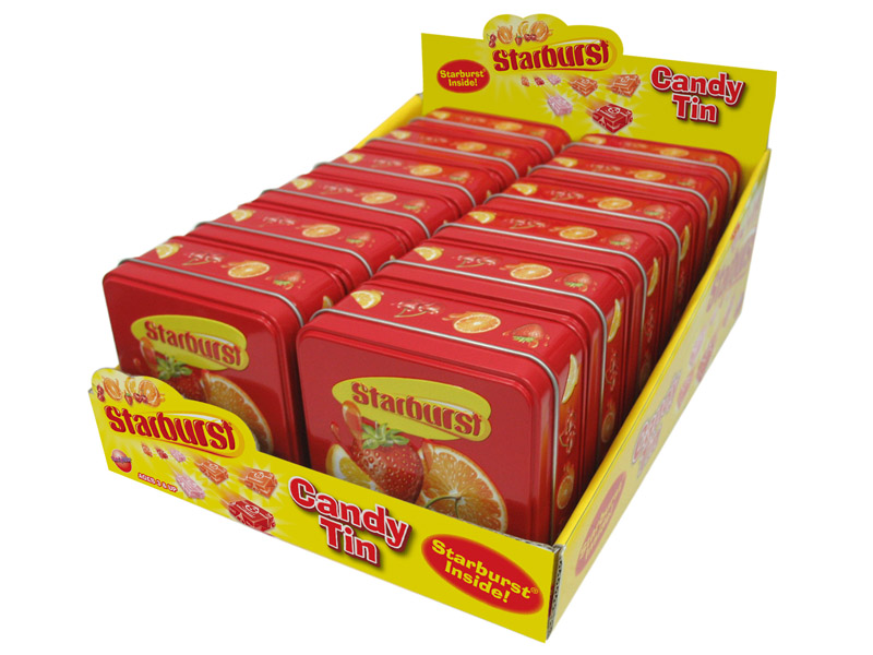 Item 18938- The awesome taste of Starburst fruit chews in these great embossed tins! Comes with 6 fun size packs of Starburst chews. Packed (6) 12 count displays per case