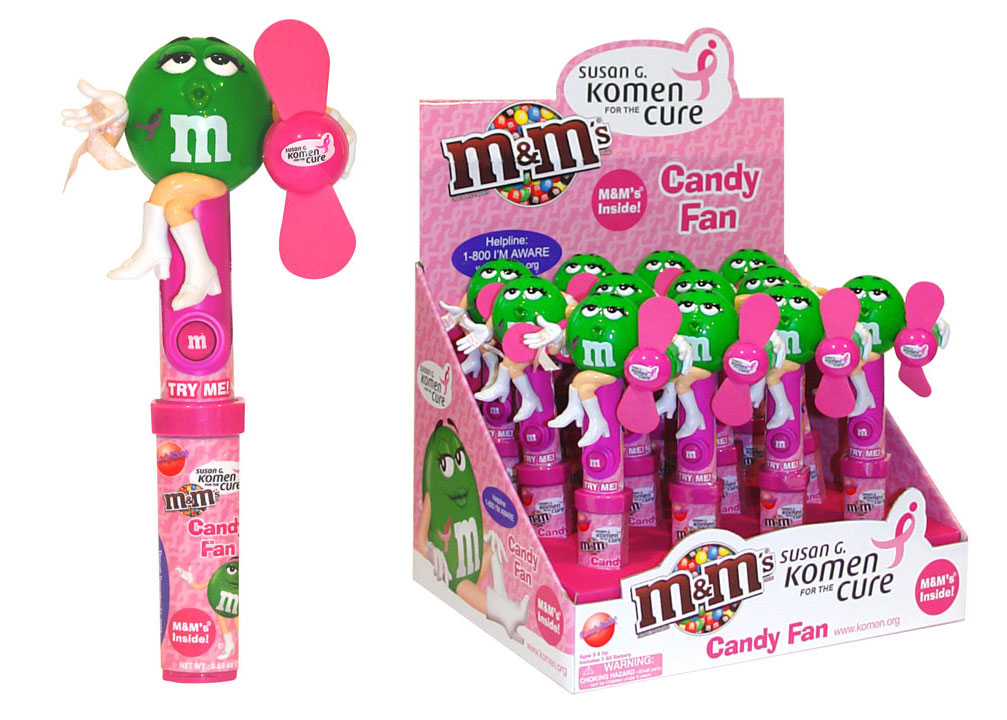 Item 59263: Partnering with the Susan G. Komen Foundation, Miss Green M&M proudly boasts her pink ribbon with this powerful, child-safe fan. Packed (6) 12 count displays per case.