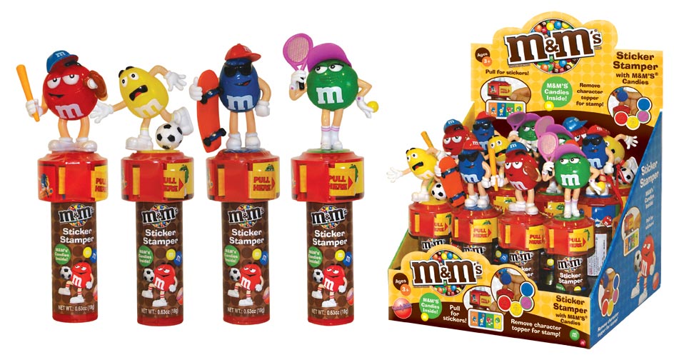 Item 19898: The fun of sports and M&M's with stickers and an inked rubber stamper! M&M's in handle. Packed (6) 12 count displays per case