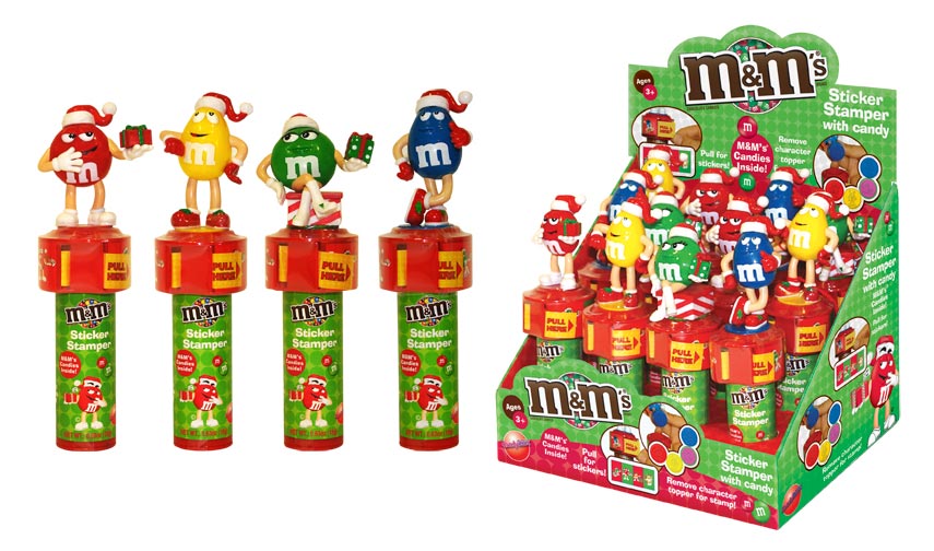 Item 59126: Everyone's favorite M&M characters dressed in their Christmas best, includes stickers and an inked rubber stamper. M&M's in handle Packed (6) 12 count displays per case.
