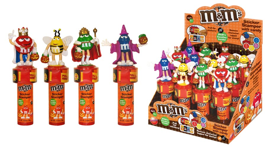 Item 59034: Everyone's favorite M&M characters dressed in their Halloween best, includes stickers and an inked rubber stamper. M&M's in handle. Packed (6) 12 count displays per case. All seasonal items have an order deadline, please contact your broker for more info
