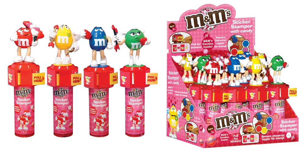 Item 59515: Everyone's favorite M&M characters all ready for Valentines Day, includes stickers and an inked rubber stamper. M&M's in handle Packed (6) 12 count displays per case.