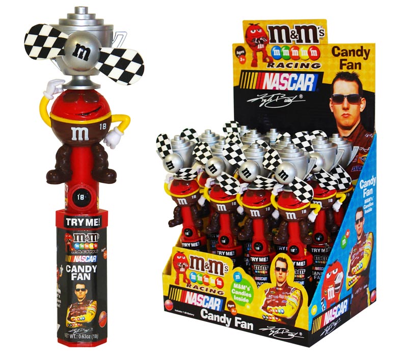 Item 4698: This powerful, child safe fan features Kyle Busch, M&M's #18 driver. M&M's in handle. Packed (6) 12 count displays per case