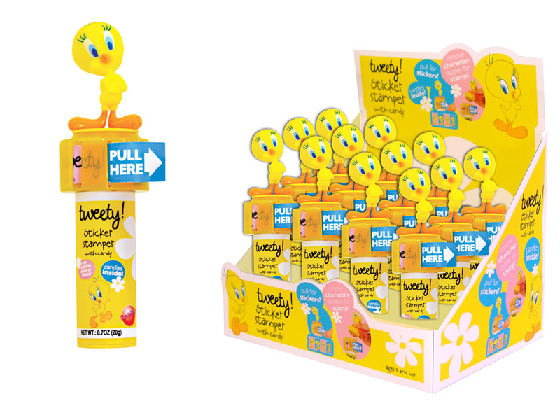 Item 19430: The cuteness of Tweety Bird along with stickers and an inked stamper! Comes with microbites candy in the handle. All natural, nothing artificial! Packed (6) 12 count displays per case.