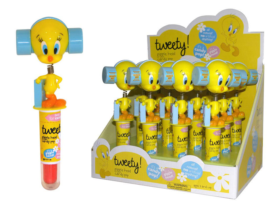 Item 4575: Shake it to the left, shake it to the right- Tweety giggles! Lollipop in the handle. All natural, nothing artificial! Packed (6) 12 count displays per case