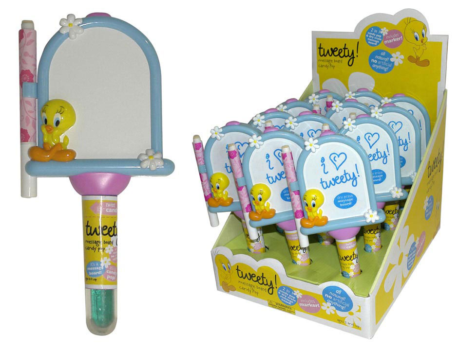 Item 4513: Write On, Wipe Off- Tweety dry erase Message Board with lollipop in the handle. All natural, nothing artificial! Packed (6) 12 count displays per case