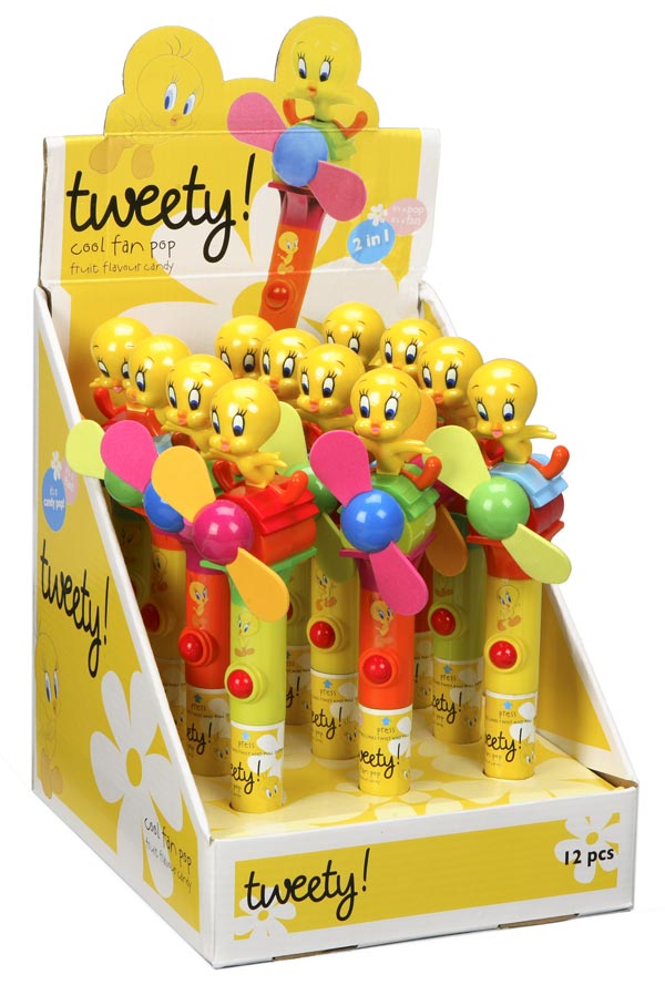 Item 4544: Tweety looks cute as the powerful, child safe fan spins. Lollipop in the handle. All natural, nothing artificial! Packed (6) 12 count displays per case