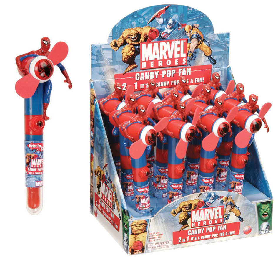 What's a cooler Cool Pop than Spider- Man?!? Spider-Man hangs on to our great Cool Pop Fans. Replaceable batteries insure a long life toy when the candy is gone! Packed 6/12's per case. #2403